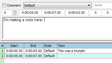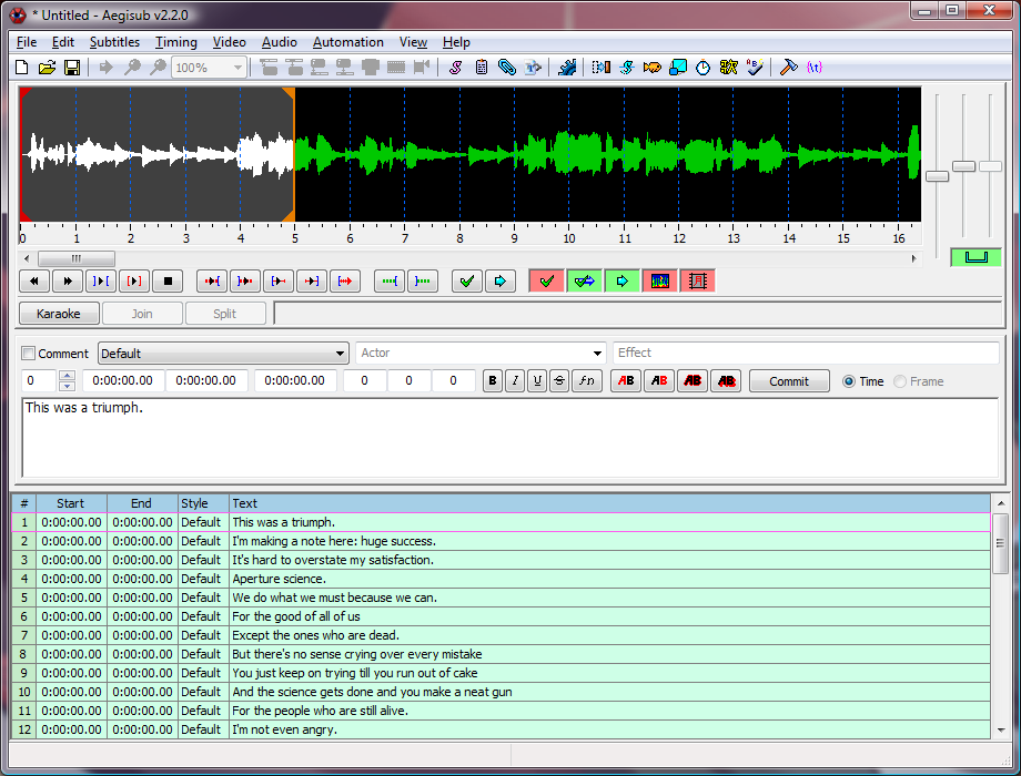 Before we start with timing, you should know that the way presented here is just one of many. There's several ways you can time to audio in Aegisub and this one might not be the best one for you. Try to also explore the program and see if you can find your own best way to do it. This is just the way I (jfs) usually do it.