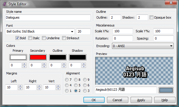 \antag. Alignments 1, 4 and 7 are flush left; 3, 6 and 9 are flush right; 2, 5 and 8 are centered. 1, 2 and 3 are "subtitles" (i.e. drawn at the bottom of the frame); 4, 5 and 6 are "midtitles" (i.e. centered vertically on the frame); 7, 8 and 9 are "toptitles" (i.e. drawn at the top of the frame). Do note that there is no such thing as a justified alignment; this is a format limitation.Outline - Controls the outline (border) thickness (and style) and the shadow offset.