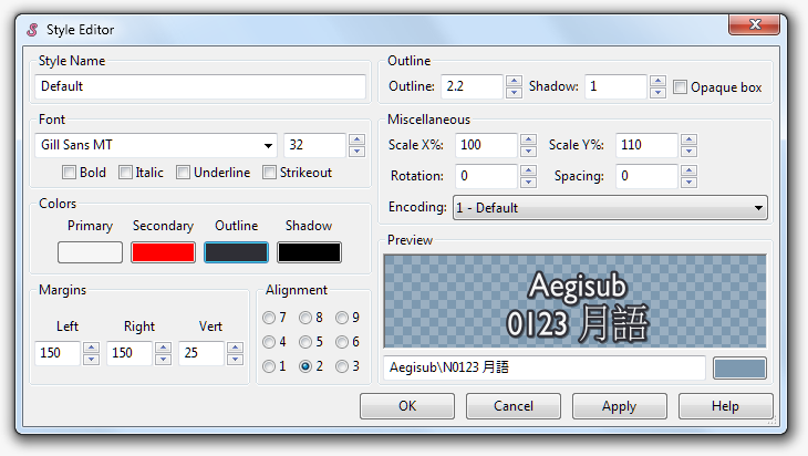 Aegisub’s styles manager tool (accessed from the Subtitles menu) provides various means of organizing, saving and editing styles. It looks like this: